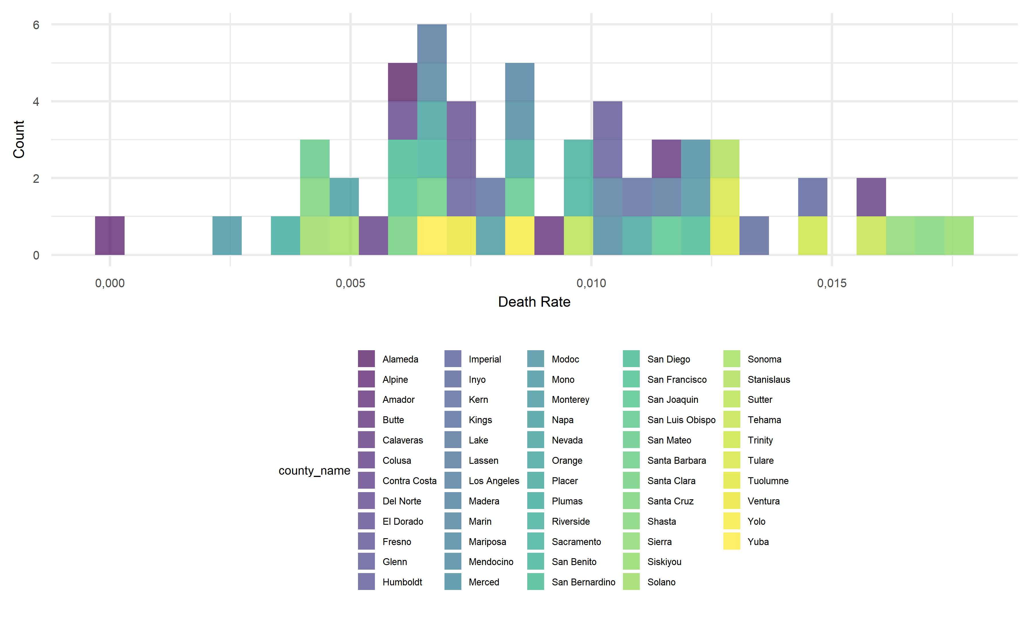 ggplot(aes(x = death_rate, fill = county_name)) +