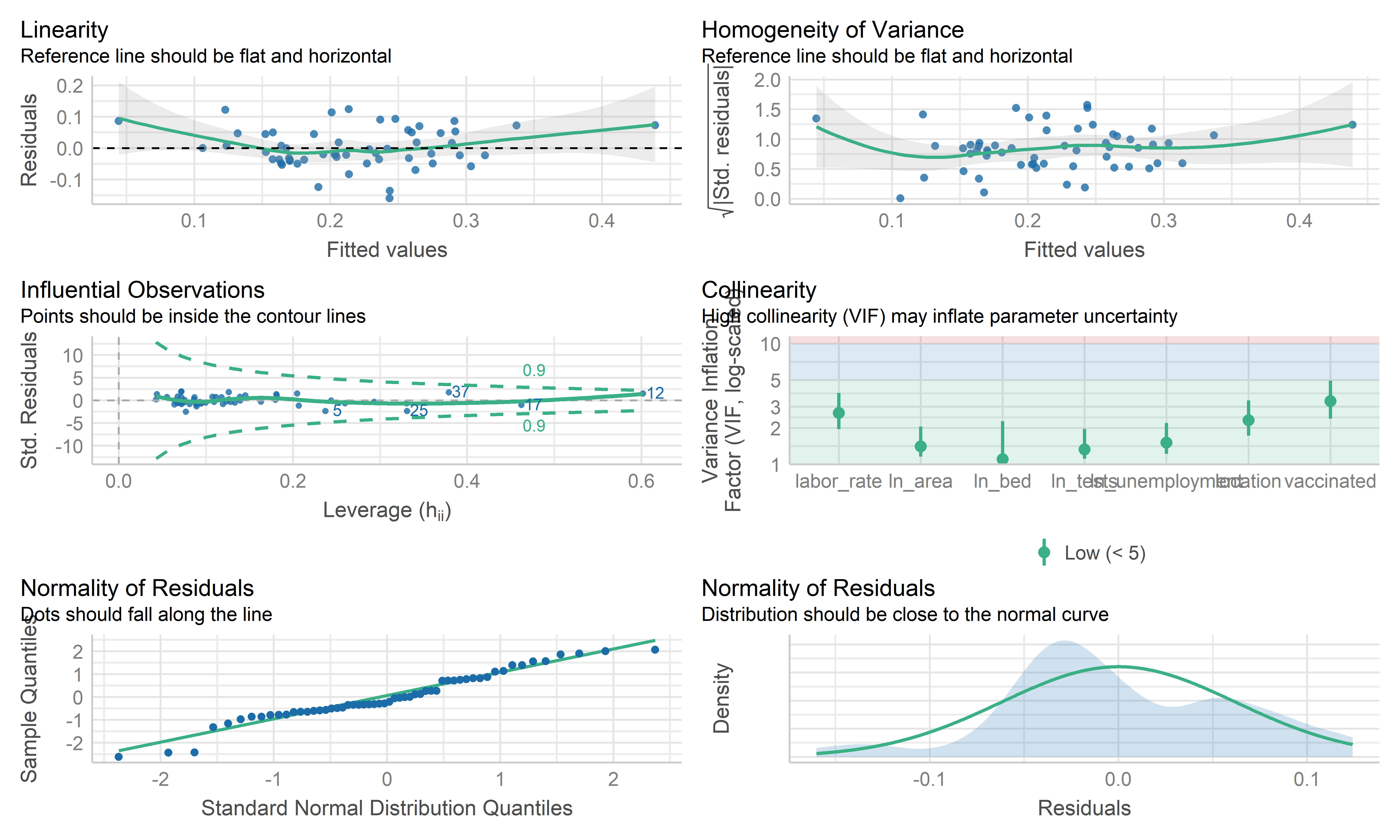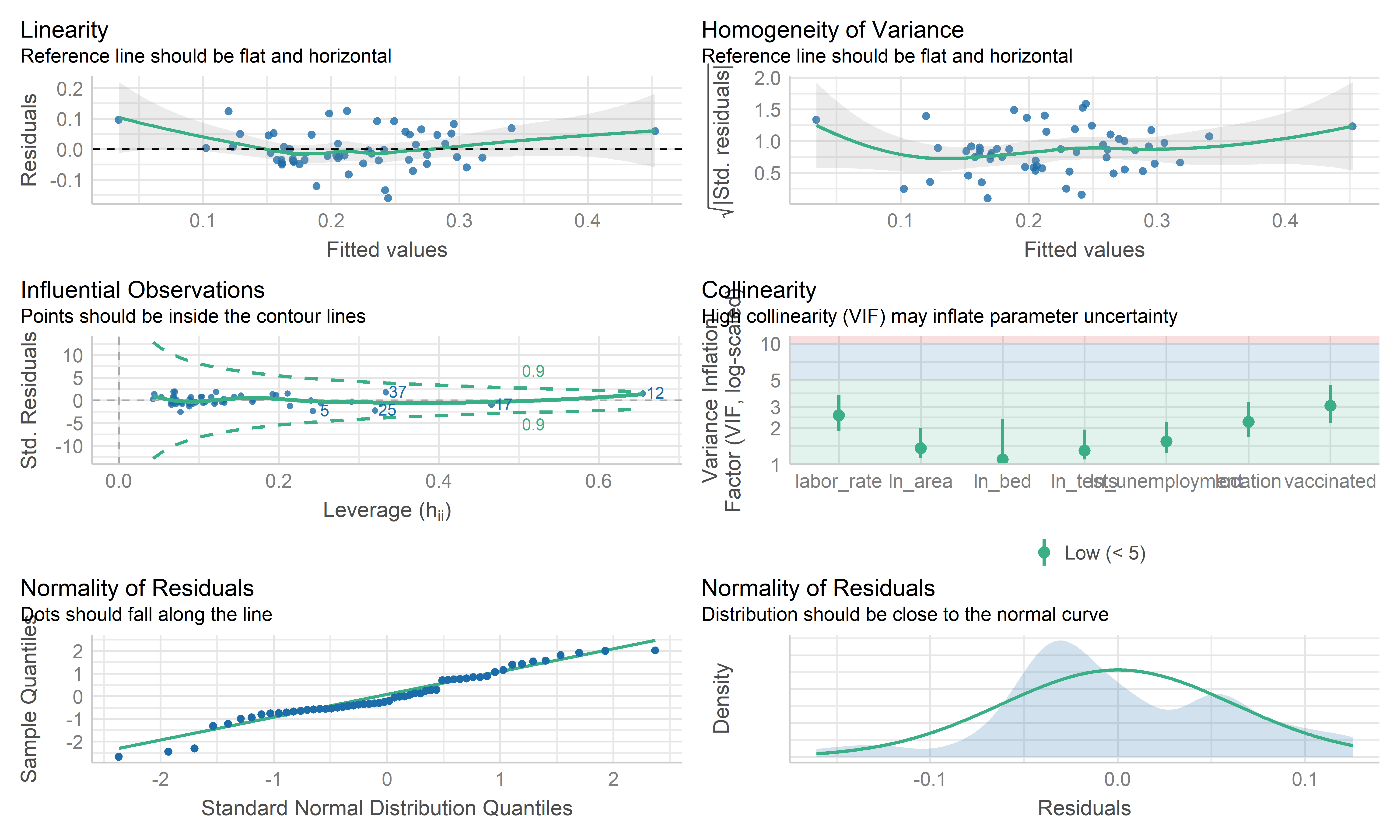 check_model(wls_death, check = c("linearity", "qq", "normality", "outliers", "homogeneity", "vif"))