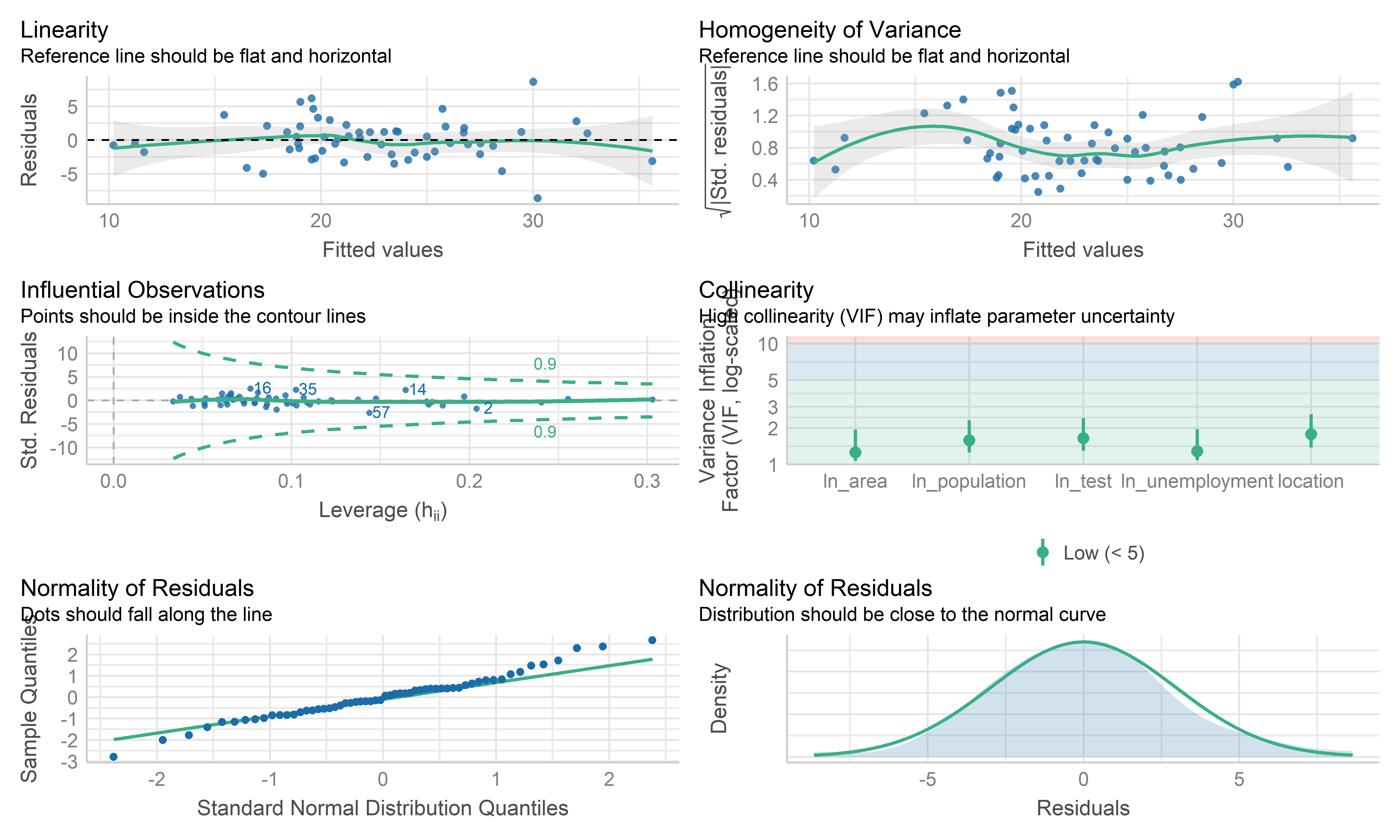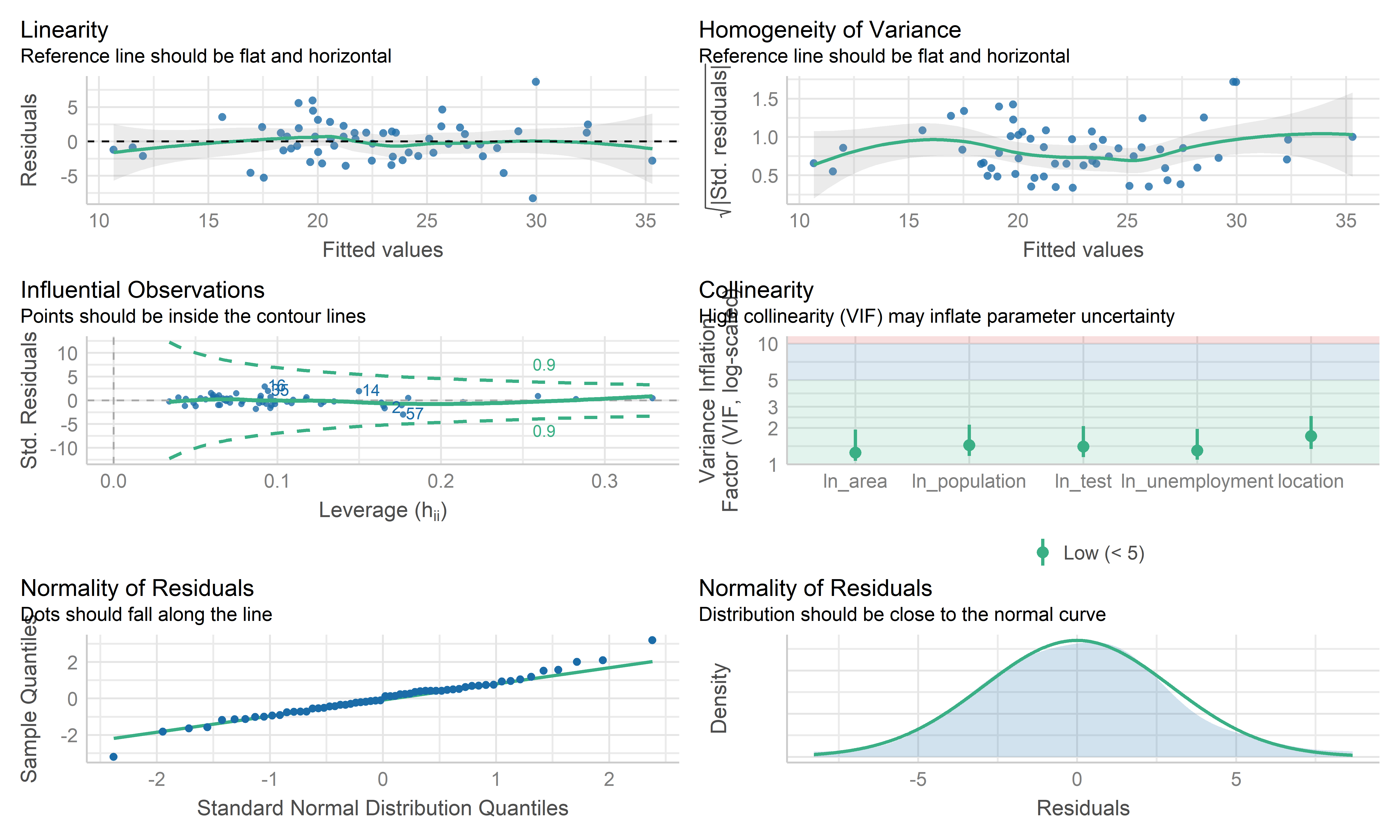 check_model(mlr_model, check = c("linearity", "qq", "normality", "outliers", "homogeneity", "vif"))