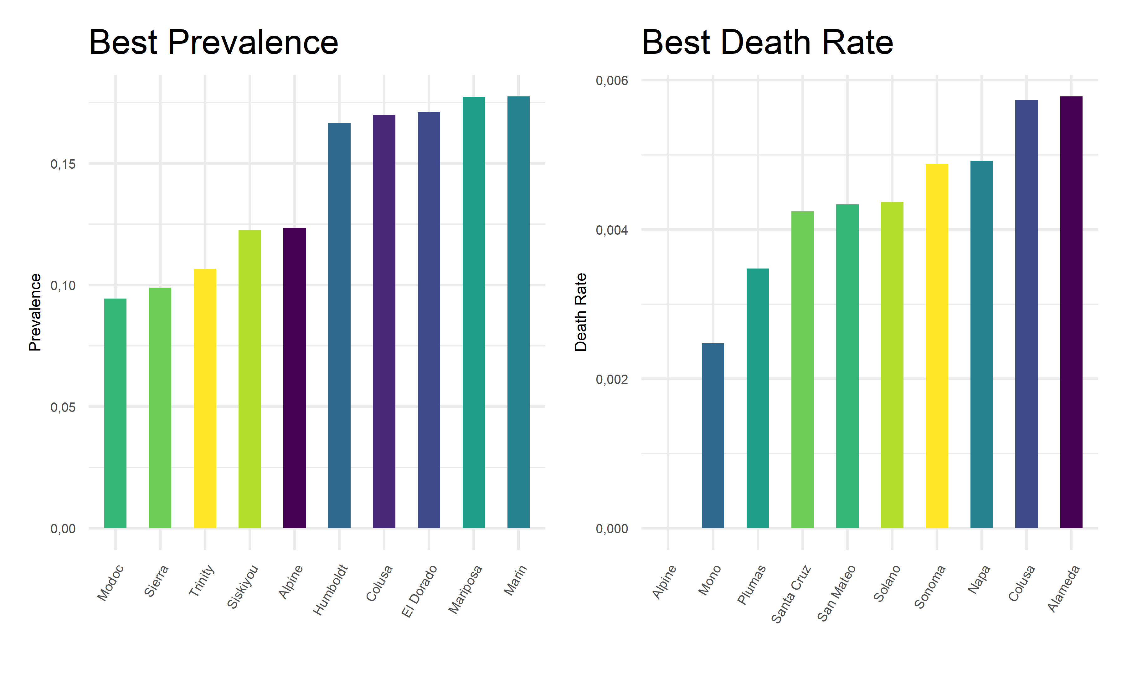 Also, we extract the 10 best covid outcome results, i.e. lowest prevalence and lowest death rates, in corresponding counties.